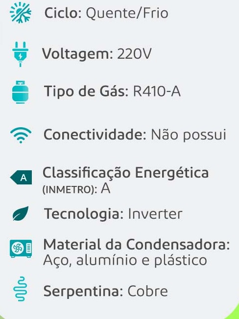 Capacidades: 30.000, 31.000, 35.000 e 36.000 Btus